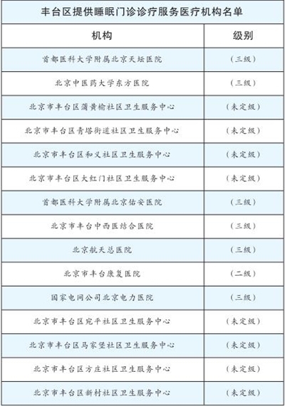 本报讯 为逐步满足市民多样化的医疗服务需求,北京市卫健委指导本市医疗机构根据机构自身情况、就诊人群特点等积极开设睡眠门诊。截至9月30日,北京市可提供睡眠门诊诊疗服务的医疗机构共有108家,其中丰台占15家。