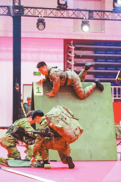 决赛分为知识竞赛和技能决赛两大部分,技能决赛设置侧身匍匐通过战术网、翻越坡度墙障碍、战场救护、横渡云梯、手枪激光模拟射击等5项内容,每轮比拼3支代表队同场竞技。