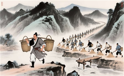 从此,刘靖一次挑四只大筐,在崎岖的山路上奔走如飞。在他的带动下,士兵、百姓个个多装快跑,卢沟河岸装满沙石的大筐,很快就堆得像小山一样高。