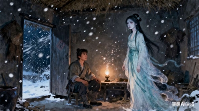 根生二十岁那年冬天,天冷得出奇,从进了腊月,纷纷扬扬的大雪便一连下了八九天。最后一天傍晚,雪下得格外大,风刮得格外猛,根生的三间破草房也更加凄冷了。根生和衣躺在炕上,觉得又冷又饿。正要吹灯睡觉,只见灯光猛然一亮,燃烧的灯芯忽地蹿起一串美丽的灯花。房门吱呀一声开了,应声走进一位飘飘若仙的姑娘。