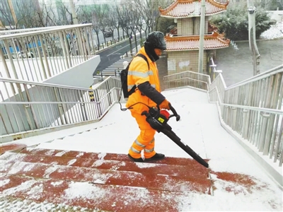 丰台环境科技有限公司通过优化作业模式、调整融雪剂使用策略,在保障出行安全的同时最大限度减少对环境的影响。环科负责区内道路1401条,总长970.91公里,其中734条道路通过“滚刷+雪铲”分段编组等方式,有效降低了融雪剂用量。对于背街小巷,则增加便携吹雪设备,实施精细化作业。丽泽路桥附近,一台特别的车辆正缓缓行进。它形似常见的道路清扫车,但车尾处多了一个方形装置。那是一个新加装的大功率吹风筒,正发出低沉而持续的嗡鸣。“这是我们今年的一项小创新。”相关负责人介绍,“这些车原本是扫地专用的,改装一下就能兼职扫雪了。”他指向车后的风筒,“原理不复杂,就是用高速气流直接把步道上的浮雪吹走,省去人工清扫,也减少融雪剂的使用。”