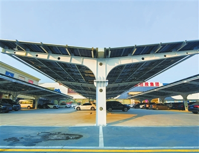 记者了解到,2兆瓦项目位于大红门集美家居广场的露天停车位上,采用装备式V字型光伏车棚造型设计,以简洁流畅的线条打造出兼具稳固性、科技感与美学价值的空间载体。3000多块高效单晶双面光伏组件整齐排布,形成一片规整有序的“能源天幕”,既为千余个车位提供遮阳避雨的贴心保障,又依托光伏组件实现绿色电能高效转化。