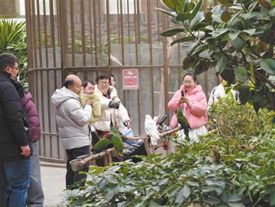 | 众多市民前往王佐镇南宫五洲植物乐园,与园中上百种、近千羽色彩绚丽的鹦鹉亲密互动,在生机盎然中迎接新年。 摄/原梓峰 |