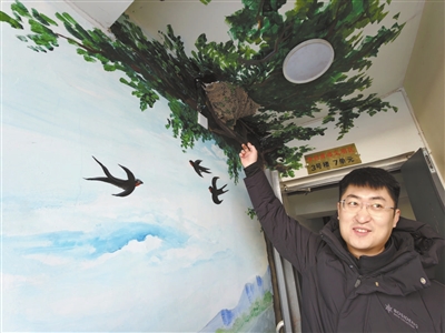 记者在走访时注意到,在6号楼与7号楼门上方,各有一个燕子窝。项目负责人告诉记者,这是小区改造前就存在的,每年春天燕子都会如期归来。“改造是‘焕新’,但不能断了这份自然的念想。”为此,施工时团队特意对这两个燕子窝做了细致的保护性防护,避免惊扰。更暖心的是,工人们随后在门洞墙面上创作了彩绘,绿意盎然的枝条间,几只燕子翩然飞舞,栩栩如生。