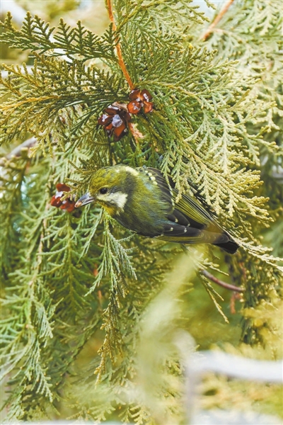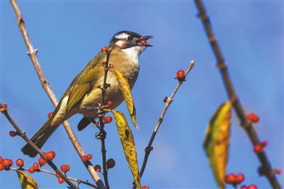 清晨的阳光刚洒上枝头,鸟儿的“干饭时间”就开始了。白头鹎在乔木树冠中穿梭,精准锁定植物的果实,一口一个吞进肚子里,吃得不亦乐乎。