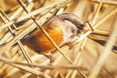 被列入北京市级重点保护鸟类的黄腹山雀,是绿堤公园的“常客”。它们体形小巧,常在灌丛间跳跃穿梭,啄食植物种子。有着“鸟中大熊猫”之称的震旦鸦雀,紧紧抓住枯萎的芦苇秆,像啄木鸟一样不断啄击,从芦苇表面或秆里寻找食物,吃完还会发出欢快的鸣叫,仿佛在炫耀自己的劳动成果。