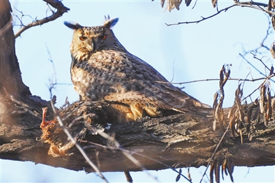 大宁水库岸边藏着一位“猛禽干饭人”——雕鸮(diāo xiāo)。作为夜行性猛禽,它常常在傍晚或夜间活动,进食时动作迅猛,尽显“空中霸主”的风范。