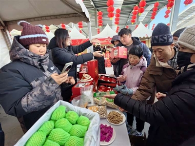 年货节设在市场果品示范大棚A3厅,延伸至专业交易区、中央批发市场、社区便民店乃至雄安新区央企驻地,形成一张覆盖广泛的服务网络。市民批量采购或就近选购,都能便捷实现,“年货送到家门口”从口号落地为现实。
