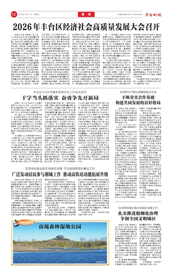 本报讯(记者 郭晓妍)2月12日,2026年丰台区经济社会高质量发展大会召开,对各方面工作再动员、再部署。区委书记王少峰强调,要深入贯彻北京市经济社会高质量发展大会精神,积极进取、开拓创新,将战略机遇切实转化为发展动能,在新时代首都发展大局中展现更大作为。区委副书记、区长张艳林部署2026年丰台区经济社会高质量发展有关工作。区人大常委会主任高峰、区政协主席李岚出席。