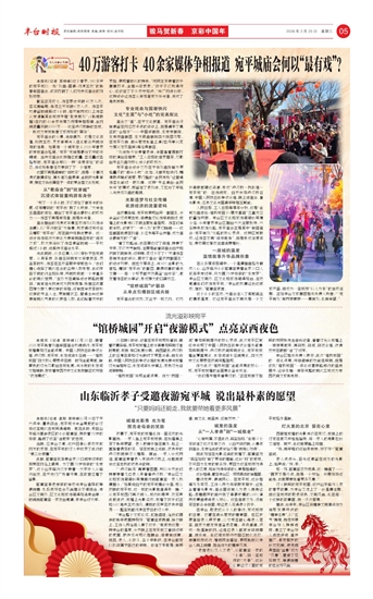 “丰台整个文旅系统,包括酒店,给我们提供的新年氛围特别好。”郁章宝感慨道,除夕晚上,工作人员给每人煮了饺子,“就感觉这是一种丰台的温度,今天晚上在宛平城又看到过年的氛围,把传统与现代相融合,非常有创意。而且,老人、小孩儿,各个年龄段,在丰台都可以找到属于自己的年味。总结下来就是:有颜值、有文化、有品质,还有历史。”