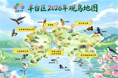 丰台区园林绿化局相关负责人,2026年,丰台区升级打造“六园和鸣”观鸟走廊,串联南苑森林湿地公园、莲花池公园、北京园博园、北宫国家森林公园、云岗森林公园和绿堤郊野公园六大核心观鸟胜地,让大家在赏花之余,邂逅百鸟齐飞的生态美景。