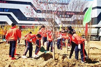 本报讯(记者 袁阳)挥锹铲土、树苗扶正、填土夯实、提桶浇水……4月7日上午,丰台区北宫镇辛庄村南营红绿灯北侧一片热火朝天的劳动景象。近百名镇机关干部、各村和社区工作人员、镇属企业职工与北宫小学30名师生一同开展义务植树活动。当天,共栽植西府海棠、玉兰、碧桃、迎春、金枝国槐等苗木220余株,为辖区再添一片新绿。