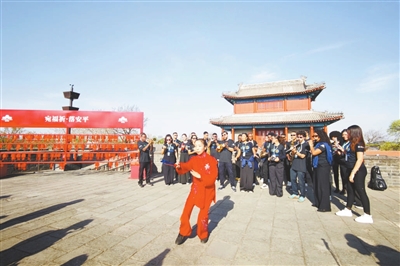 本报讯(记者 袁阳)4月11日下午,宛平城西城楼上,一曲熟悉的《茉莉花》旋律在春风中响起。演唱者是来自巴西里约热内卢市的非物质文化遗产“科帕卡巴纳要塞管弦乐团”的乐手们。他们用中文演绎着这首中国民歌,前方一身红衣的中国太极拳表演者手持太极扇,缓起势、转体、推掌,动作张弛有度。蓝天下,红与黑、动与静,在古老的城墙上构成一幅跨越时空的画卷。