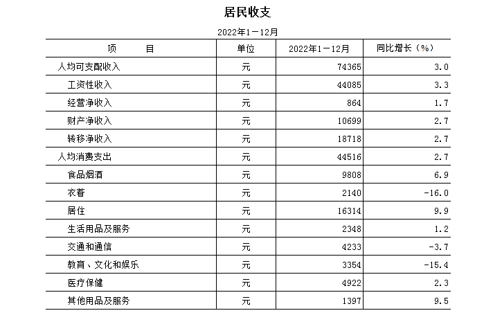 消费支出:指住户用于满足家庭日常生活消费需要的全部支出,包括用于消费品的支出和用于服务性消费的支出。根据用途不同,消费支出可划分为食品烟酒、衣着、居住、生活用品及服务、交通和通信、教育文化和娱乐、医疗保健、其他用品及服务八大类。