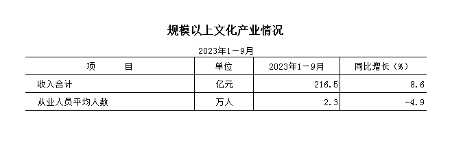 本表数据统计范围为规模以上文化产业法人单位,具体为:1.工业:年主营业务收入2000万元及以上的法人单位。2.批发业:年主营业务收入2000万元及以上的法人单位。3.零售业:年主营业务收入500万元及以上的法人单位。4.居民服务、修理和其他服务业:年营业收入500万元以上的法人单位。5.文化、体育和娱乐业:年营业收入500万元以上的法人单位。6.信息传输、软件和信息技术服务业:年营业收入2000万元以上的法人单位。7.水利、环境和公共设施管理业:年营业收入2000万元以上的服务业法人单位。8.交通运输、仓储和邮政业:年营业收入2000万元以上的服务业法人单位。9.其他服务业:年营业收入1000万元以上的法人单位。