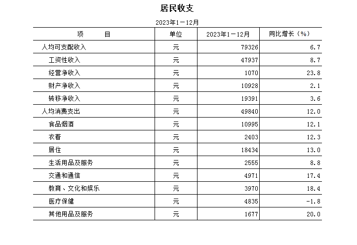 消费支出:指住户用于满足家庭日常生活消费需要的全部支出,包括用于消费品的支出和用于服务性消费的支出。根据用途不同,消费支出可划分为食品烟酒、衣着、居住、生活用品及服务、交通和通信、教育文化和娱乐、医疗保健、其他用品及服务八大类。