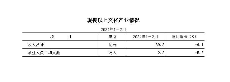 本表数据统计范围为规模以上文化产业法人单位,具体为:1.工业:年主营业务收入2000万元及以上的法人单位。2.批发业:年主营业务收入2000万元及以上的法人单位。3.零售业:年主营业务收入500万元及以上的法人单位。4.居民服务、修理和其他服务业:年营业收入500万元以上的法人单位。5.文化、体育和娱乐业:年营业收入500万元以上的法人单位。6.信息传输、软件和信息技术服务业:年营业收入2000万元以上的法人单位。7.水利、环境和公共设施管理业:年营业收入2000万元以上的服务业法人单位。8.交通运输、仓储和邮政业:年营业收入2000万元以上的服务业法人单位。9.其他服务业:年营业收入1000万元以上的法人单位。