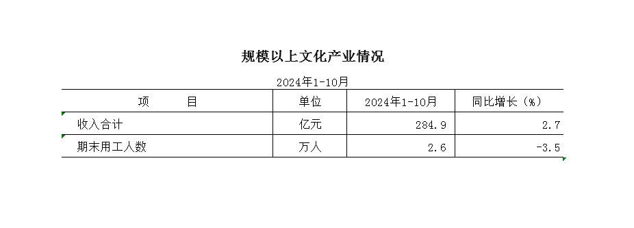 本表数据统计范围为规模以上文化产业法人单位,具体为:1.工业:年主营业务收入2000万元及以上的法人单位。2.批发业:年主营业务收入2000万元及以上的法人单位。3.零售业:年主营业务收入500万元及以上的法人单位。4.居民服务、修理和其他服务业:年营业收入500万元以上的法人单位。5.文化、体育和娱乐业:年营业收入500万元以上的法人单位。6.信息传输、软件和信息技术服务业:年营业收入2000万元以上的法人单位。7.水利、环境和公共设施管理业:年营业收入2000万元以上的服务业法人单位。8.交通运输、仓储和邮政业:年营业收入2000万元以上的服务业法人单位。9.其他服务业:年营业收入1000万元以上的法人单位。