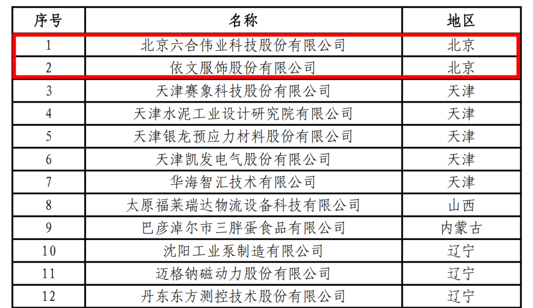 近日,工业和信息化部公示了第四批服务型制造示范名单,中关村丰台园北京六合伟业科技股份有限公司、依文服饰股份有限公司2家企业入选示范企业名单。