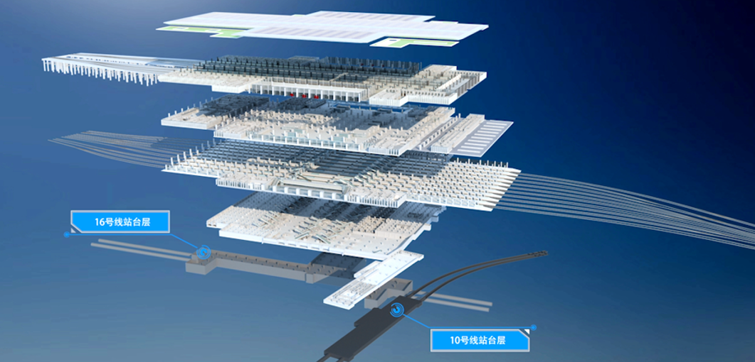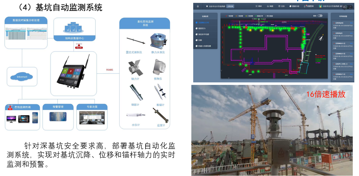 以丰台站为例,丰台站是我国第一座采用高速、普速客运车场重叠布置的铁路客站,地面层为普速车场,正上方23米标高层为高架车场。改变了传统铁路线路的布置方式,实现了铁路功能布设的创新,形成“顶层跑高铁、地面跑普速、地下通地铁”的立体交通模式。在面临施工现场用地狭小,无法临时堆放大量大型重型构件等难题,中铁建工项目团队通力合作,以三维模型为载体,自主研发基于BIM+GIS的钢结构全生命周期管理平台,将BIM、GIS、物联网、信息化、大数据等技术融入丰台站钢结构全生命周期管理,强化项目全生命周期信息的互联互通,提高质量、降低建造成本。通过BIM模型信息自动集成、工厂ERP(企业资源计划)系统自动抓取和施工APP系统自动采集等手段,将多源生产和管理数据集成到钢结构构件和零件中,以信息数据反向驱动前端BIM模型可视化交互,覆盖钢结构从设计、深化、加工、物流、现场、交验等共6个阶段16个环节的精细管理,为工程的钢结构建造管理提供了及时、高效的管理途径。把智能监控系统、无人机倾斜摄影技术、“测量机器人”、“实测实量机器人”等多项技术作为常规应用,实现工程进度可视化管理,节省了大量的人力和人为误差导致的隐患,大幅度提高了工作效率和工作质量。