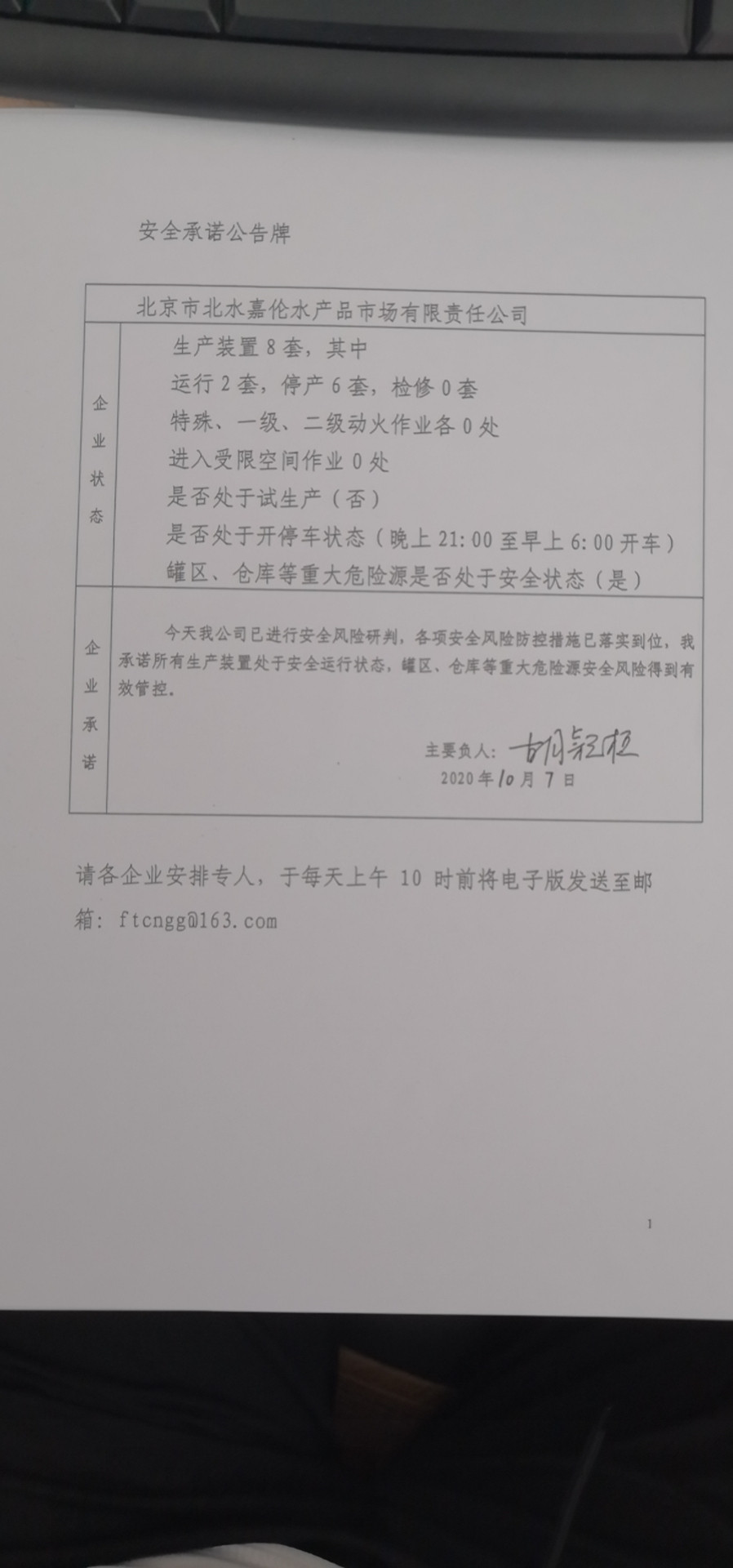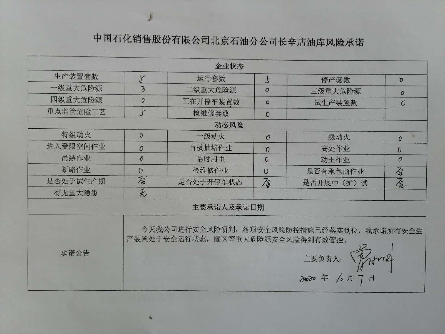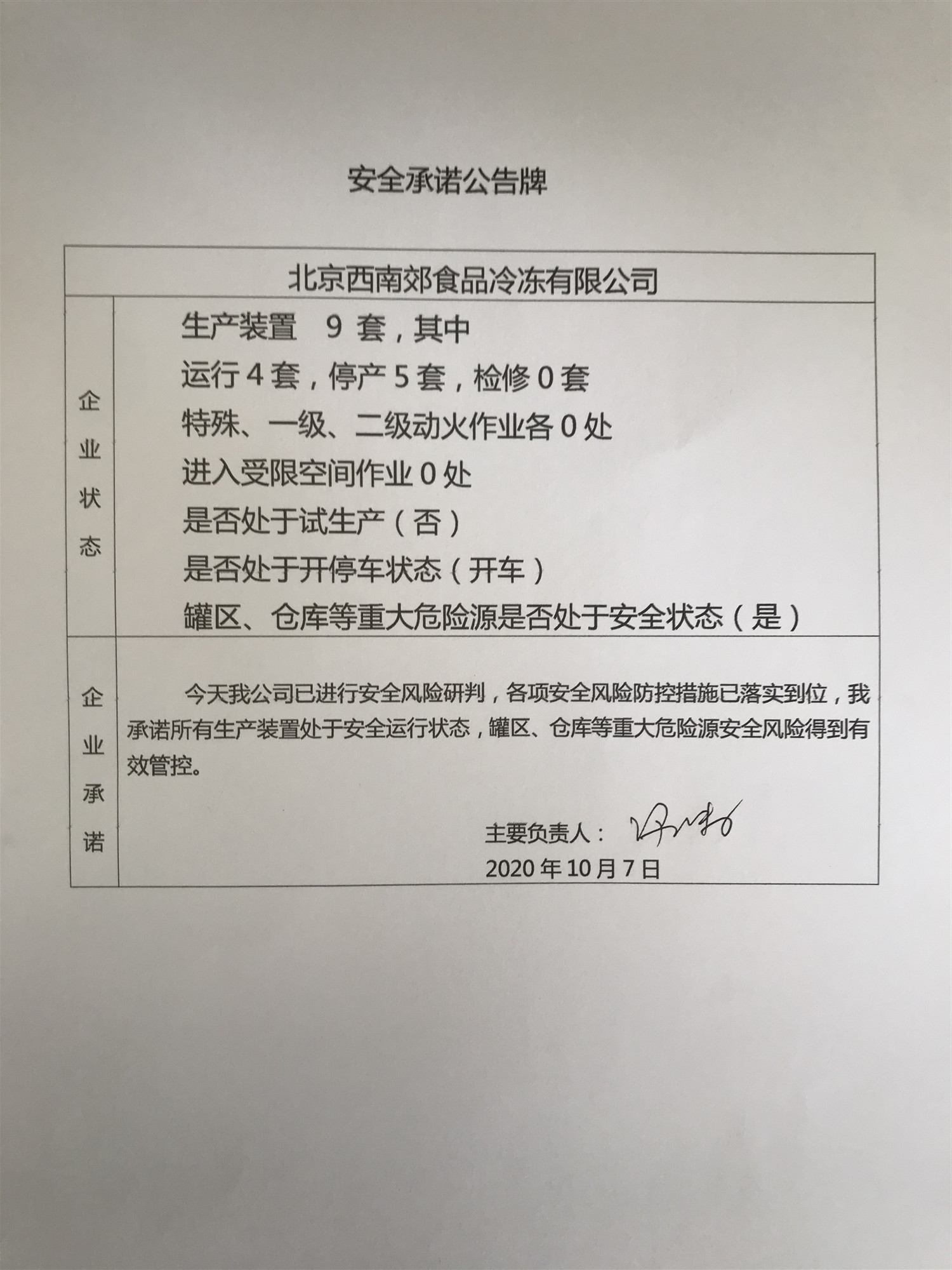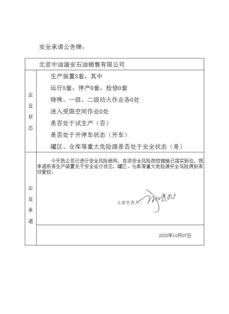 北京中油潞安石油销售有限公司、中国石化销售股份有限公司北京石油分公司长辛店油库、北京西南郊食品冷冻有限公司、北京市北水嘉伦水产品市场有限责任公司安全承诺公告牌10.7