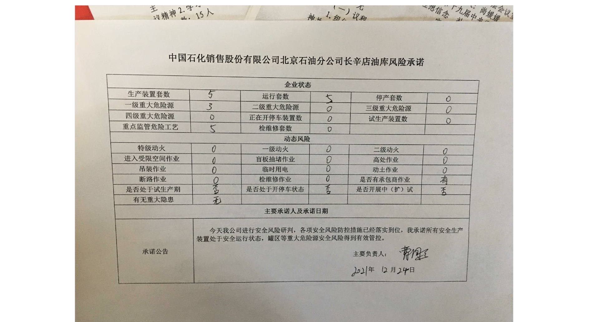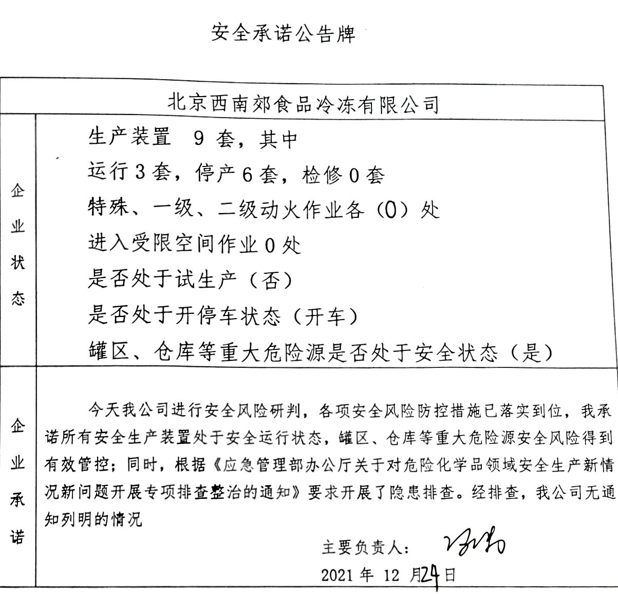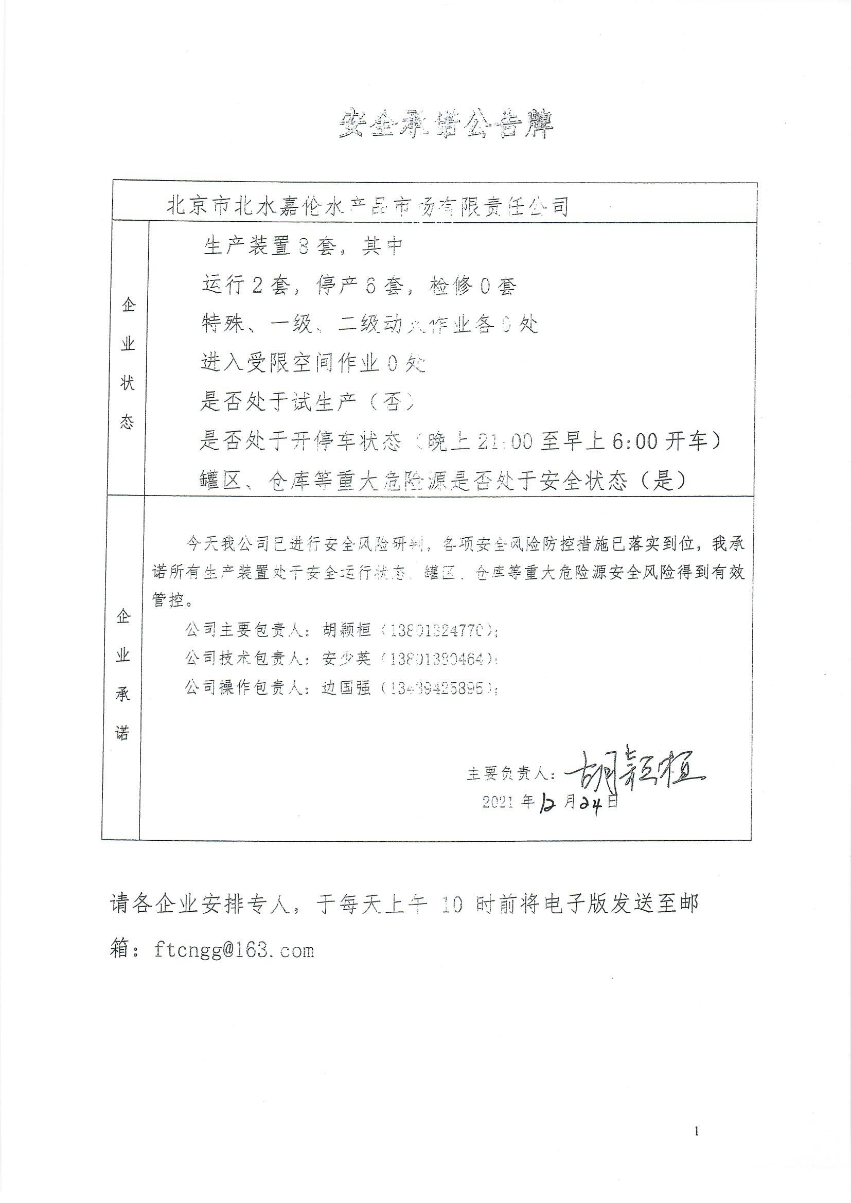 北京市北水嘉伦水产品市场有限责任公司、北京西南郊食品冷冻有限公司、中国石化销售有限公司北京长辛店石油库、北京中油潞安石油销售有限公司安全承诺公告牌12.24