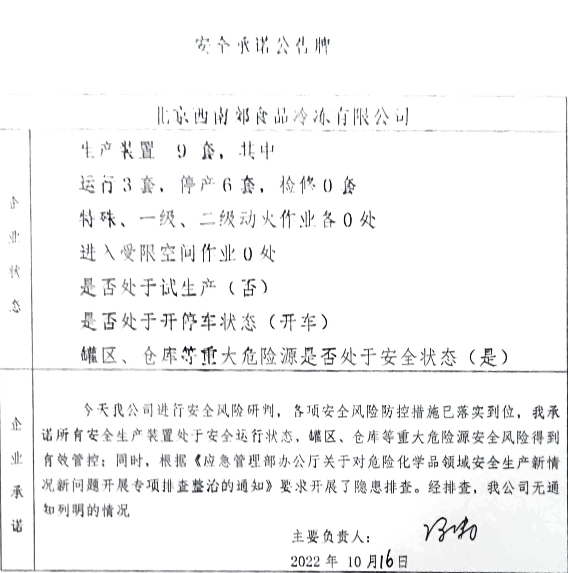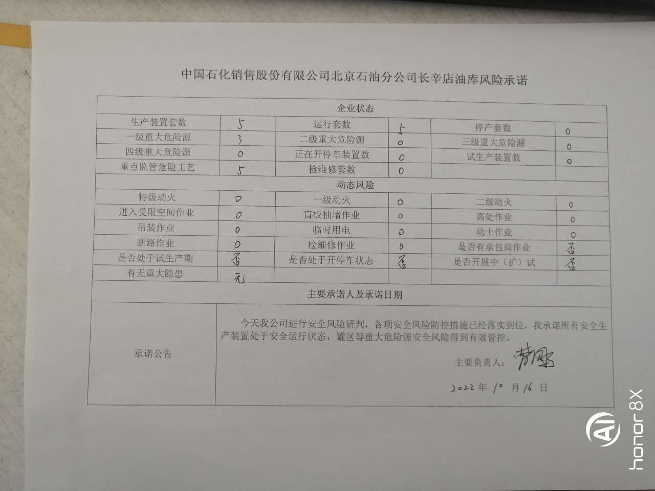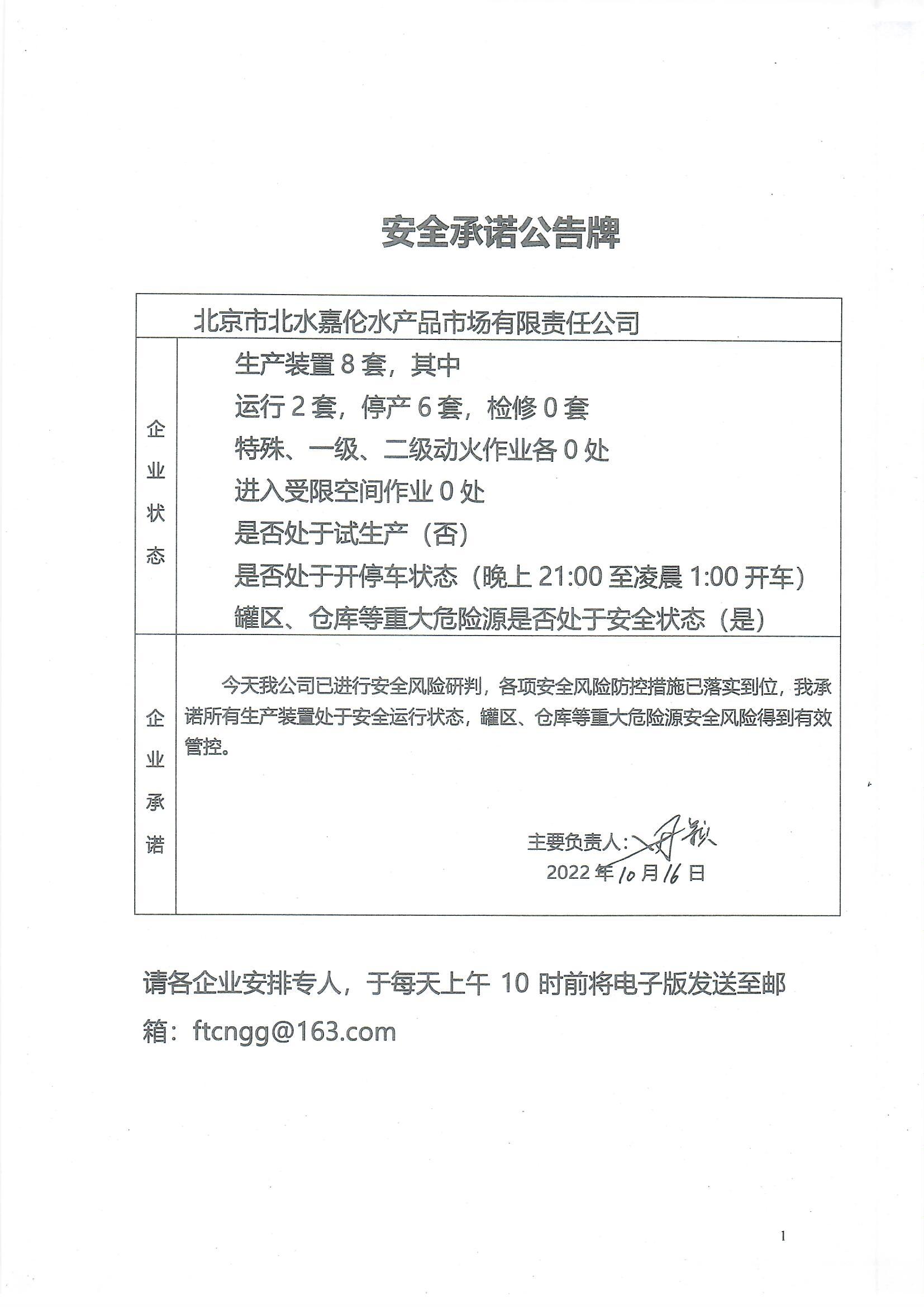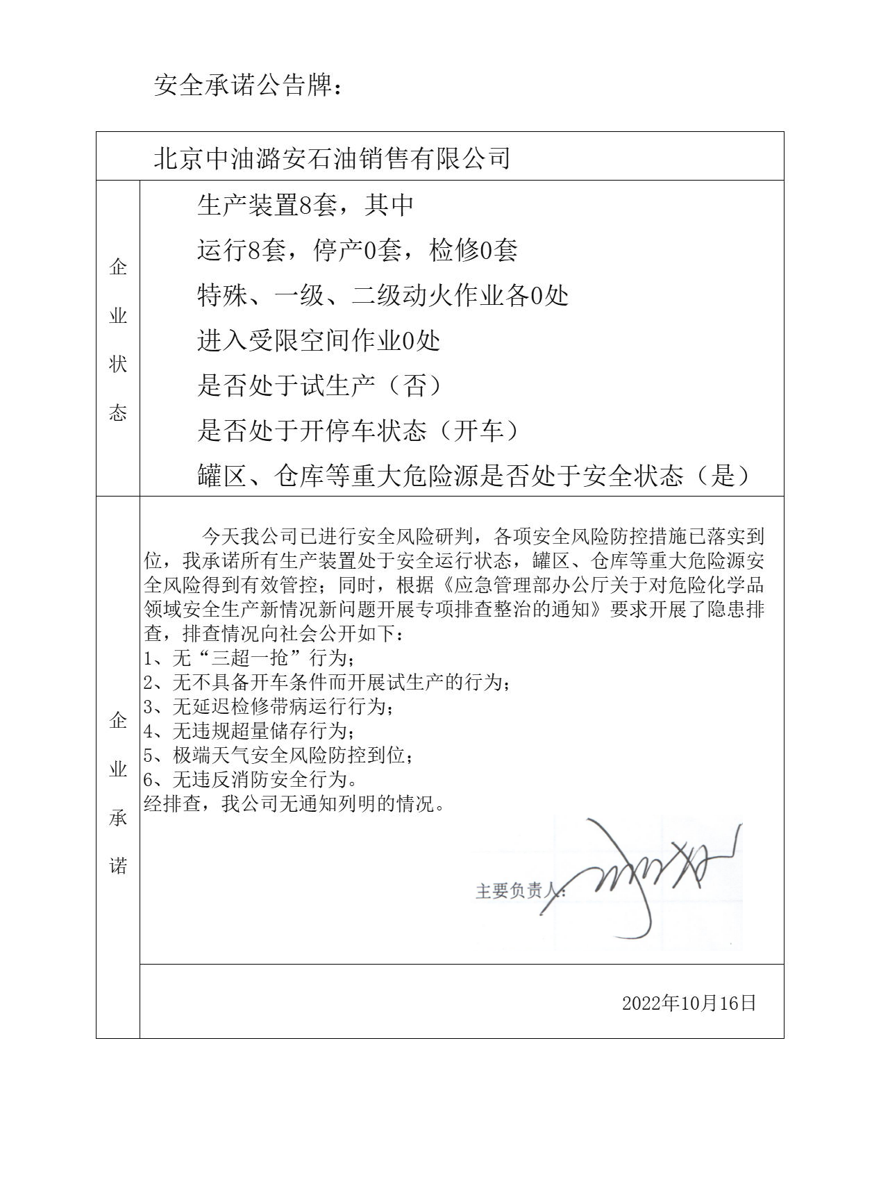 北京市北水嘉伦水产有限品市场责任公司、中国石化销售有限公司北京长辛店石油库、北京中油潞安石油销售有限公司安全承诺公告牌10.16