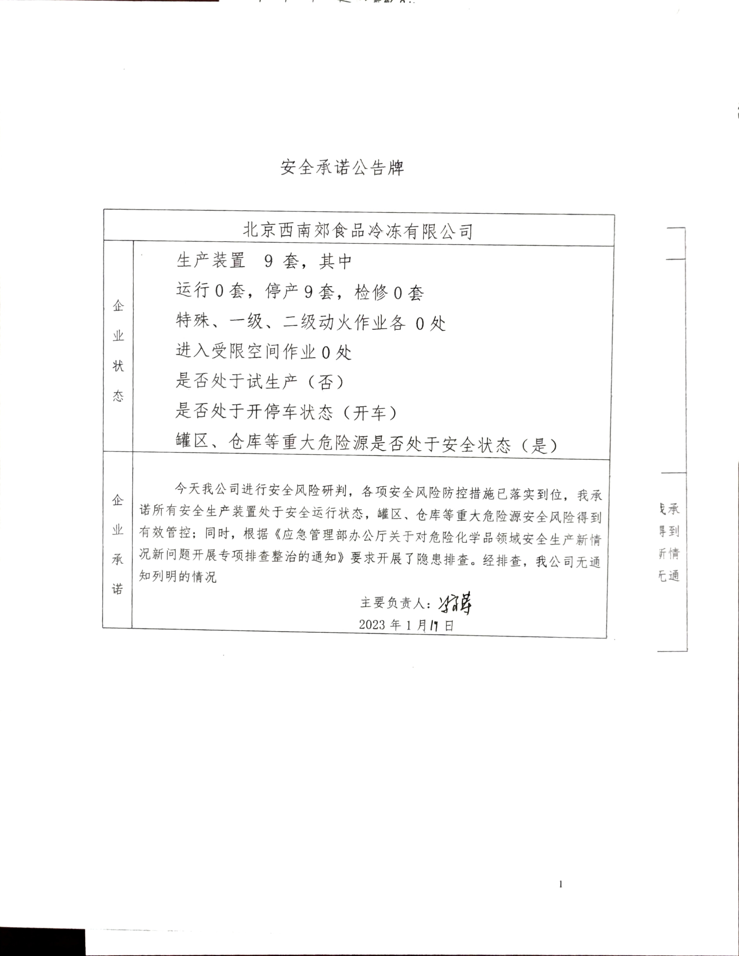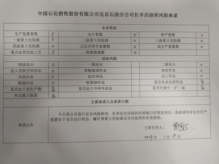 北京市北水嘉伦水产有限品市场责任公司、中国石化销售有限公司北京长辛店石油库、北京中油潞安石油销售有限公司安全承诺公告牌01.19