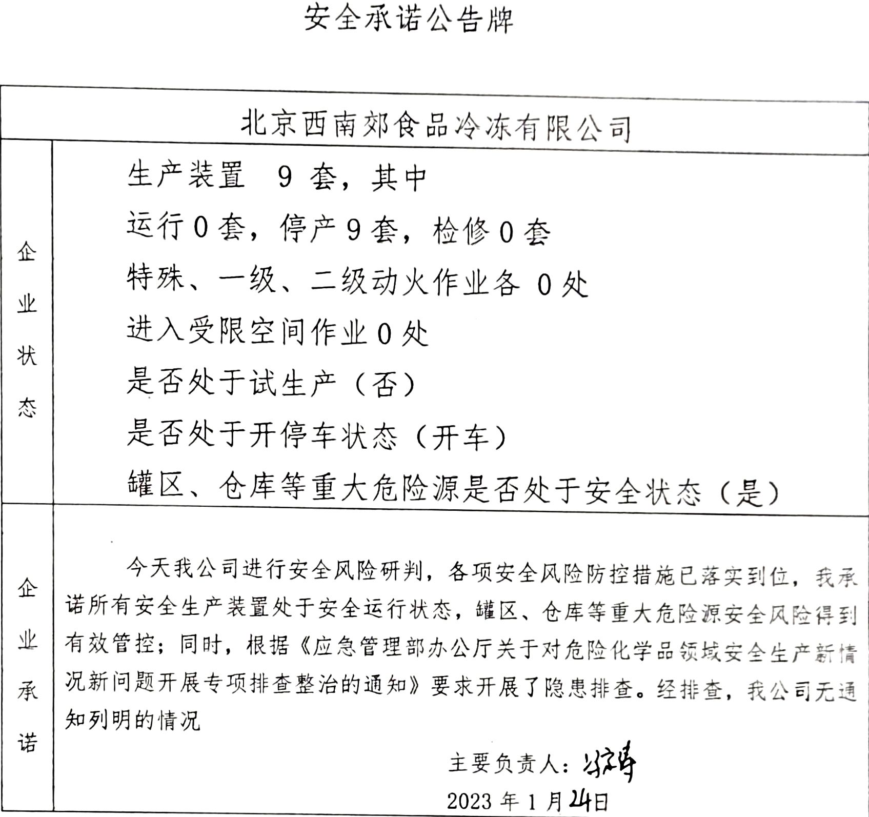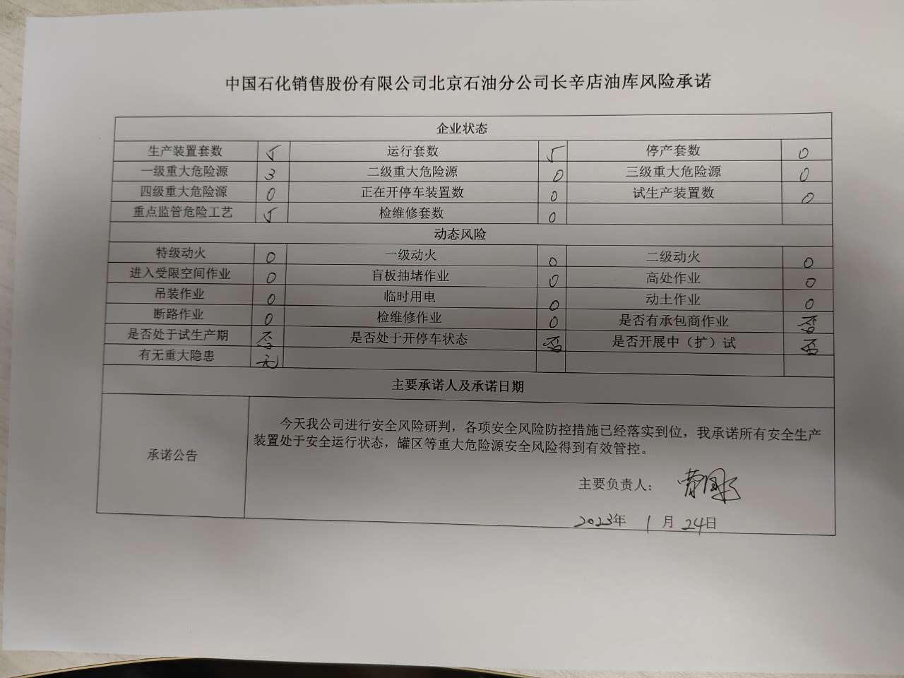 北京市北水嘉伦水产有限品市场责任公司、中国石化销售有限公司北京长辛店石油库、北京中油潞安石油销售有限公司安全承诺公告牌01.24