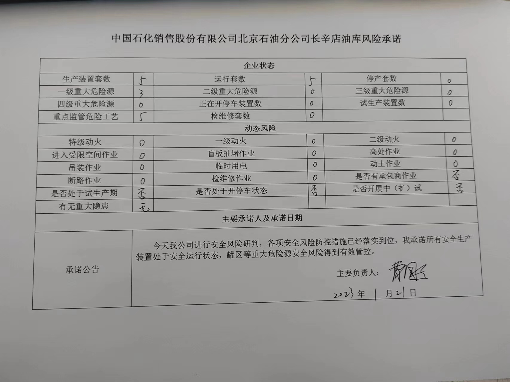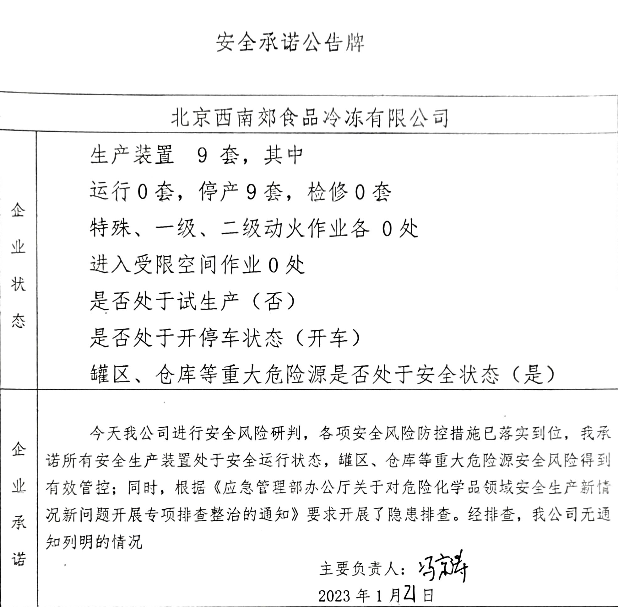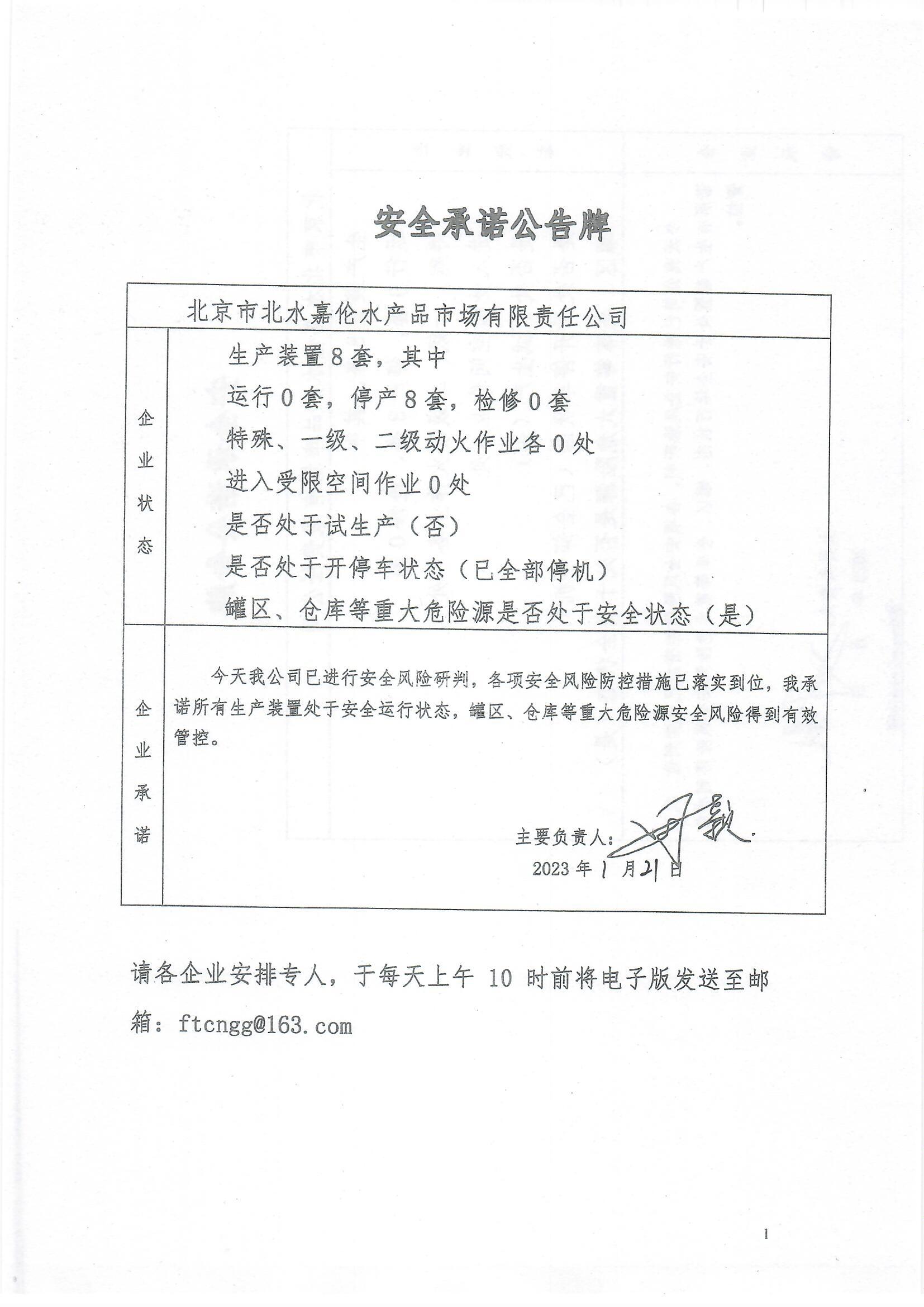 北京市北水嘉伦水产有限品市场责任公司、中国石化销售有限公司北京长辛店石油库、北京中油潞安石油销售有限公司安全承诺公告牌01.21