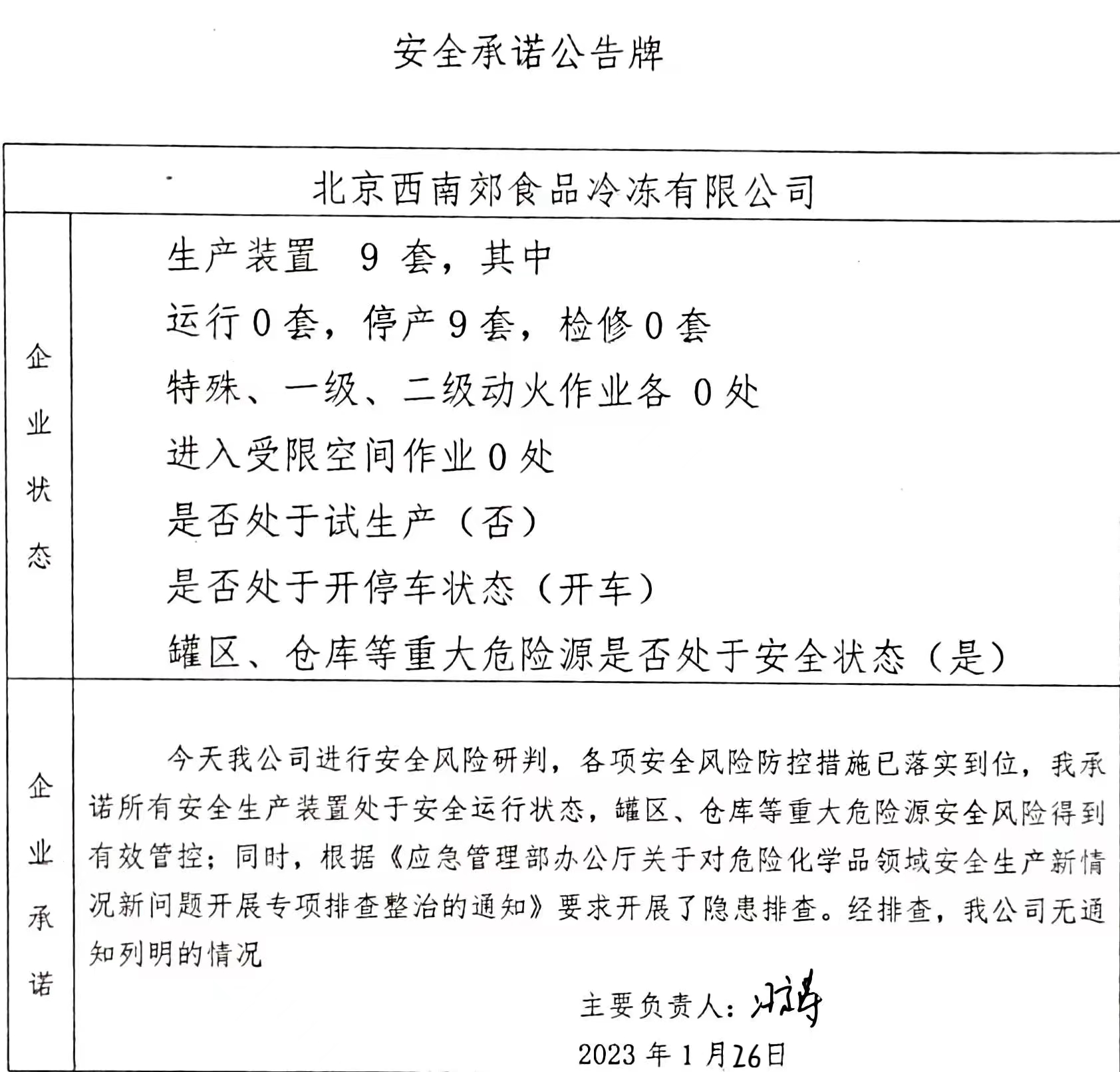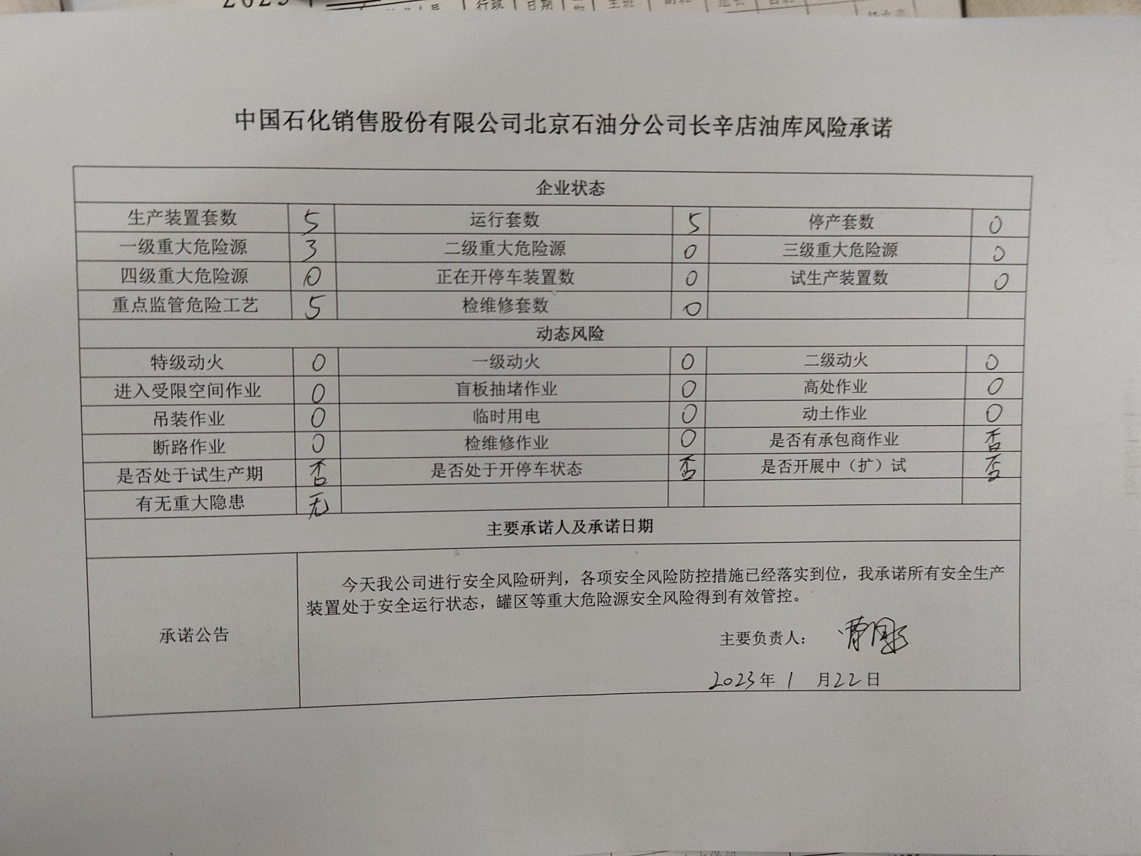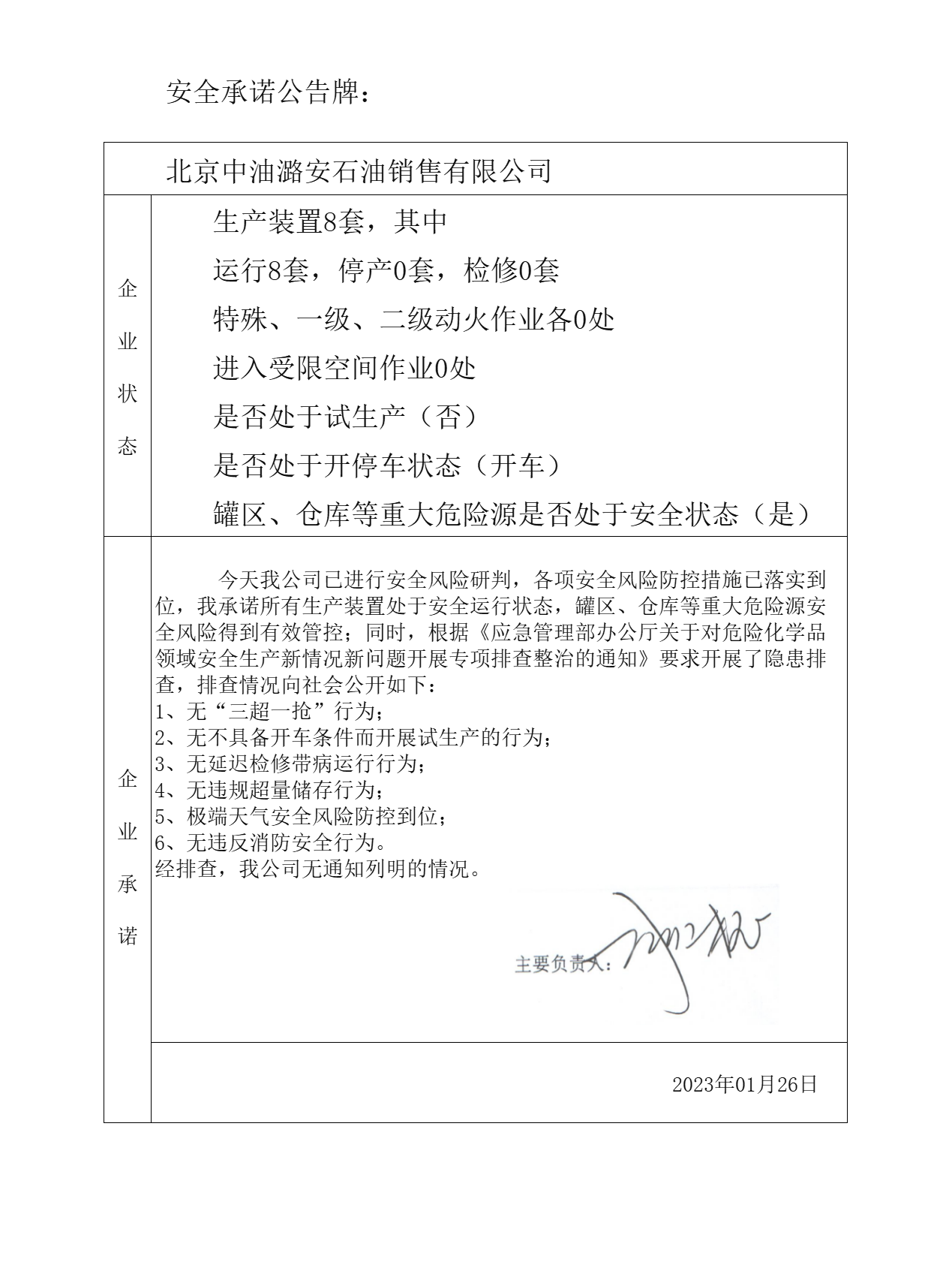 北京市北水嘉伦水产有限品市场责任公司、中国石化销售有限公司北京长辛店石油库、北京中油潞安石油销售有限公司安全承诺公告牌01.26