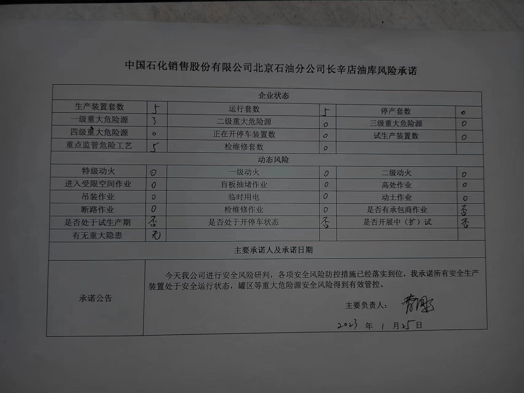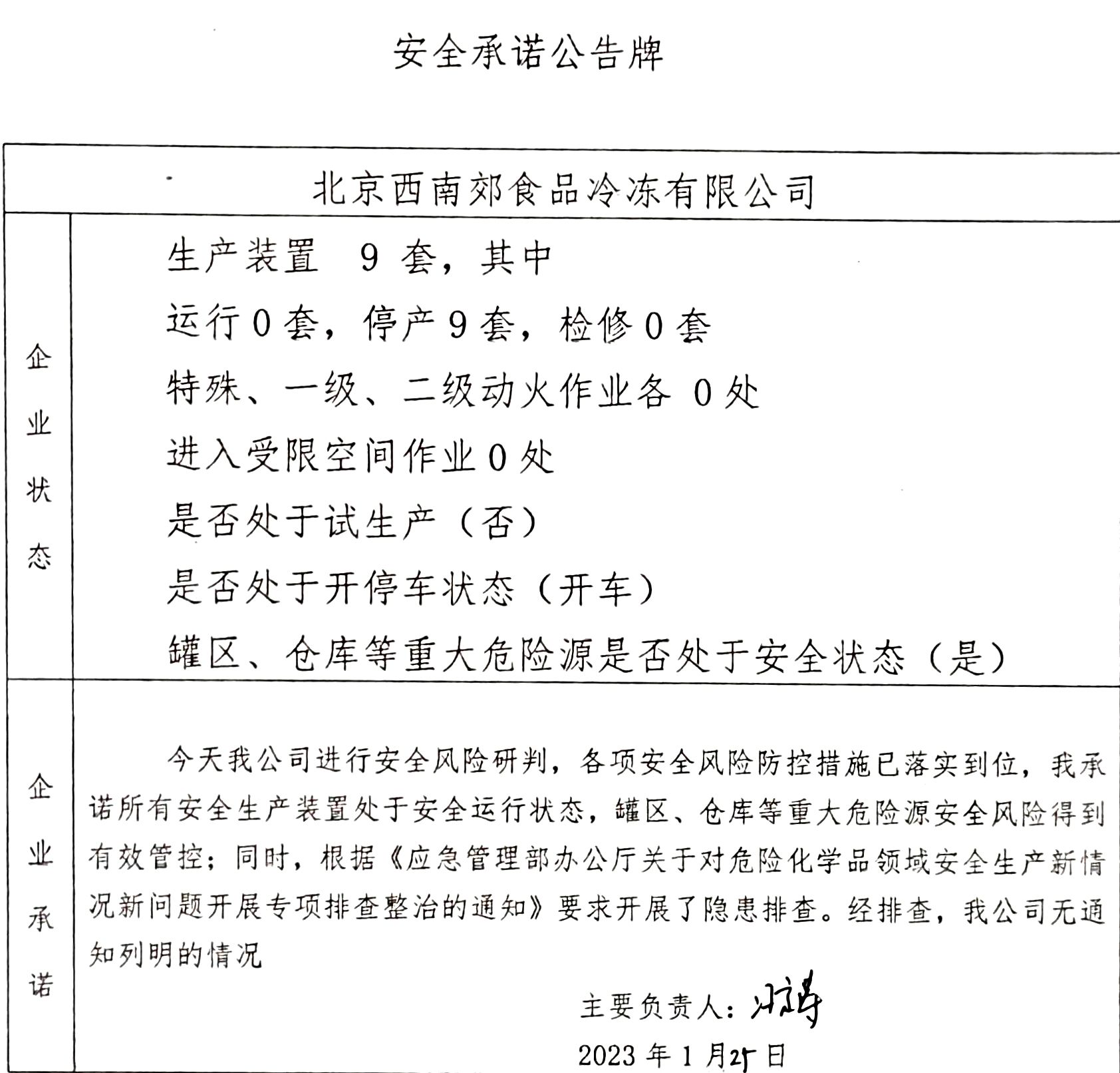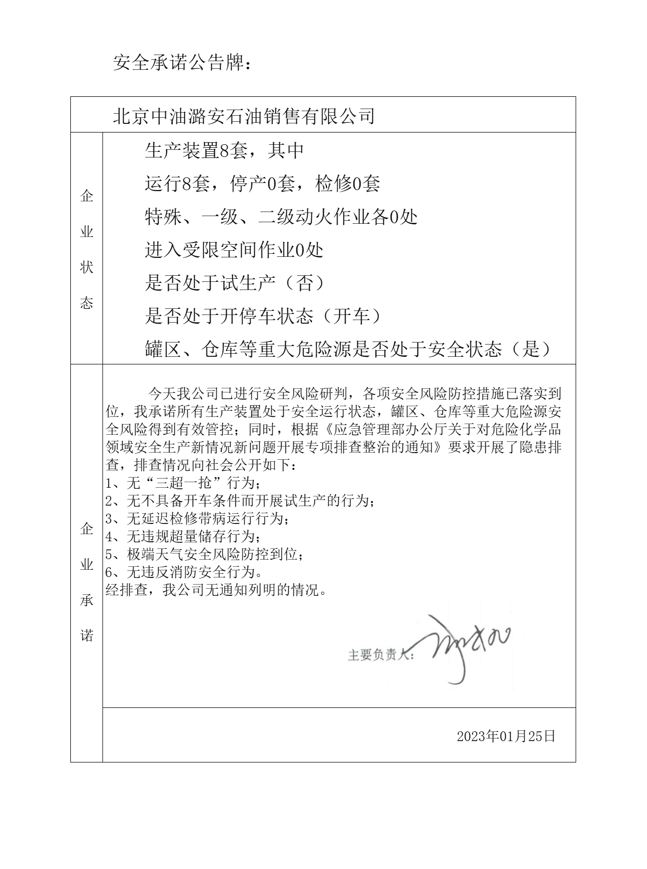 北京市北水嘉伦水产有限品市场责任公司、中国石化销售有限公司北京长辛店石油库、北京中油潞安石油销售有限公司安全承诺公告牌01.25