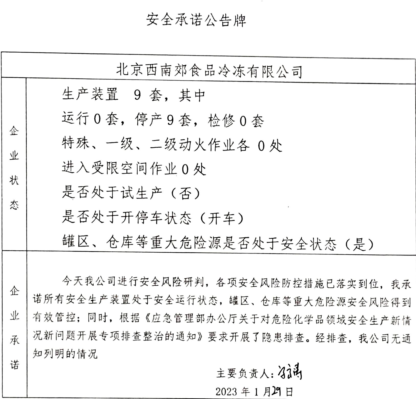 北京市北水嘉伦水产有限品市场责任公司、中国石化销售有限公司北京长辛店石油库、北京中油潞安石油销售有限公司安全承诺公告牌01.29
