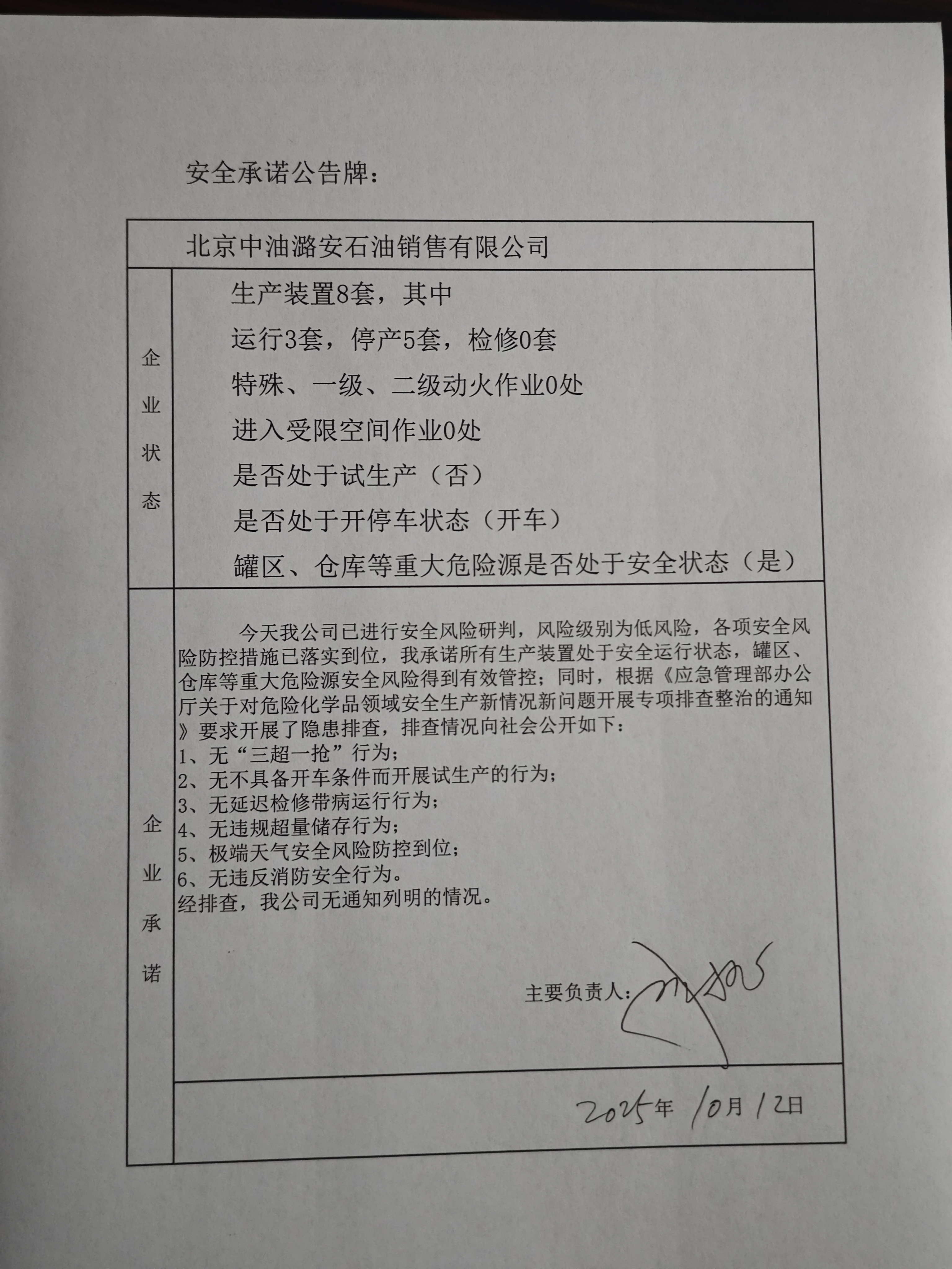 北京中油潞安石油销售有限公司安全承诺公告牌1012