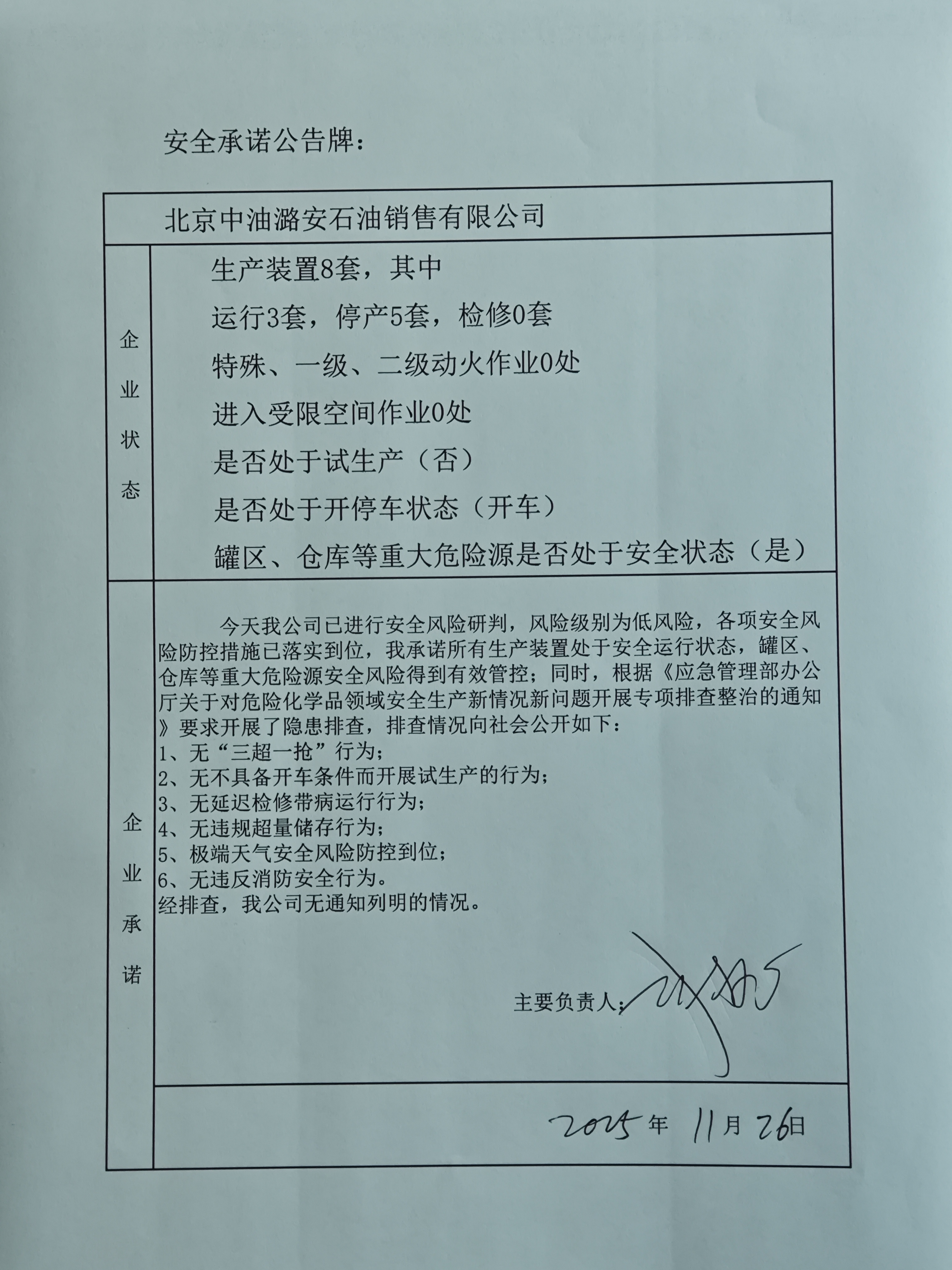 北京中油潞安石油销售有限公司安全承诺公告牌20251126