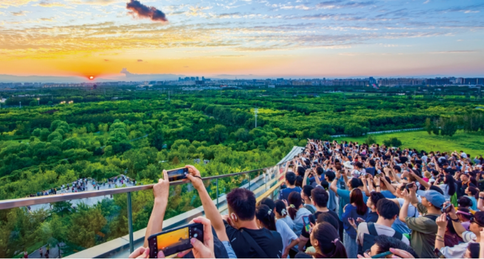 南苑森林湿地公园位于北京市丰台区南部,南四环与南五环之间,定位为首都南部结构性生态绿肺、享誉世界的千年历史名苑,目前已建成万亩。与此同时,南苑森林湿地公园正在积极建设高品质生物多样性示范区,建成后将成为北京中轴线上生物多样性最丰富的超大型蓝绿空间、北京中心城区内最大的候鸟栖息地和观鸟胜地、人与自然和谐共生的首都生态大花园。南苑森林湿地公园燕景台建筑面积1044.69平方米,总高度59米。燕景台突出南苑地区囿台文化,充分利用北京南部片区自然景观制高点的地理优势设计建设而成。燕景台正式开放以来,成为热门网红打卡地,“上南森看北京”成为新时尚。