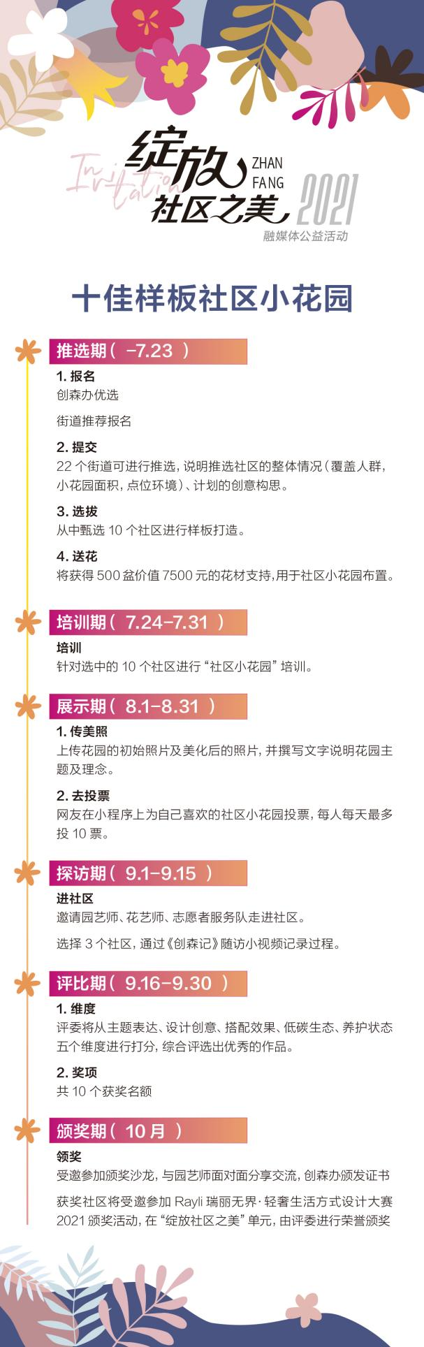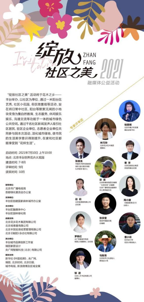 本次活动由北京市广播电视局、首都绿化委员会办公室指导,丰台区创建国家森林城市办公室支持,丰台区融媒体中心和丰台区园林绿化局联合主办,北京花乡花木集团有限公司、北京肯德基有限公司、北京丰贸投资经营管理有限公司协办,丰台城市品牌创新工作室承办。作为“妙笔生花看丰台”丰台城市品牌全媒推介行动重点活动,“绽放社区之美”融媒体公益活动以花为媒,分别从家庭、社区、街区三个层面倡导共建“国家森林城市”。通过征集、建造、探访、评选等一系列举措,评选推出“最美家庭花艺阳台”“十佳样板社区小花园” “十佳示范街区微景观”。