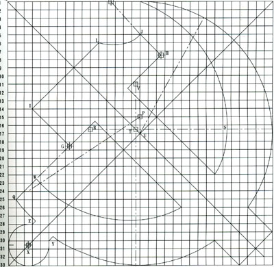 3 镰刀的画法:以M点(17、17′)为圆心、MN(N点为17、1′)为半径画弧⌒NO(O点为17、33′);以P点(17、15′)为圆心、PO为半径画弧,与HG的延长线交于Q点;以R点(1116′、17′中点)为圆心、RN为半径画弧,与通过R点的水平线交于S点;以T点(16、1716′、17′的中点)为圆心、TS为半径画弧,与通过T点的垂直线交于U点;以V点(16、1711′中点)为圆心、VU为半径画弧,与HG的延长线交于W,构成镰刀。以X点(3、4 30′、31′的中点)为圆心作圆与AB、BC线相切,从Y点(6、30′)、Z点(4、28′)分别作直线平行于BD,构成镰刀把。