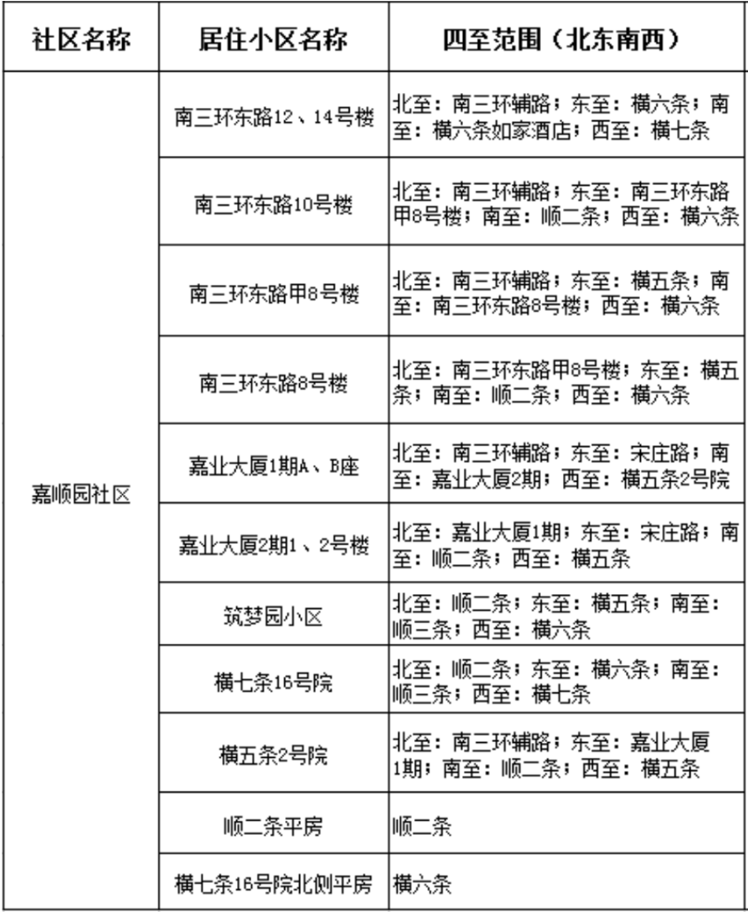 嘉顺园社区:北至南三环东路中心线,南至顺三条路中心线,东至宋庄路中心线,西至横七条路中心线。