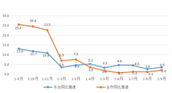 图1 2021年1-9月至2022年1-9月丰台园与全市总收入同比增速对比图