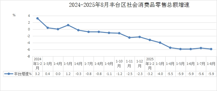 1-8月,丰台区实现社会消费品零售总额548.9亿元,同比下降5.9%,低于北京市平均增速0.8个百分点。丰台区零售总量居全市第四位,增速居第十位。按消费形态分,商品零售466.2亿元,同比下降5.6%;餐饮收入82.7亿元,同比下降8.1%。