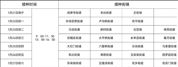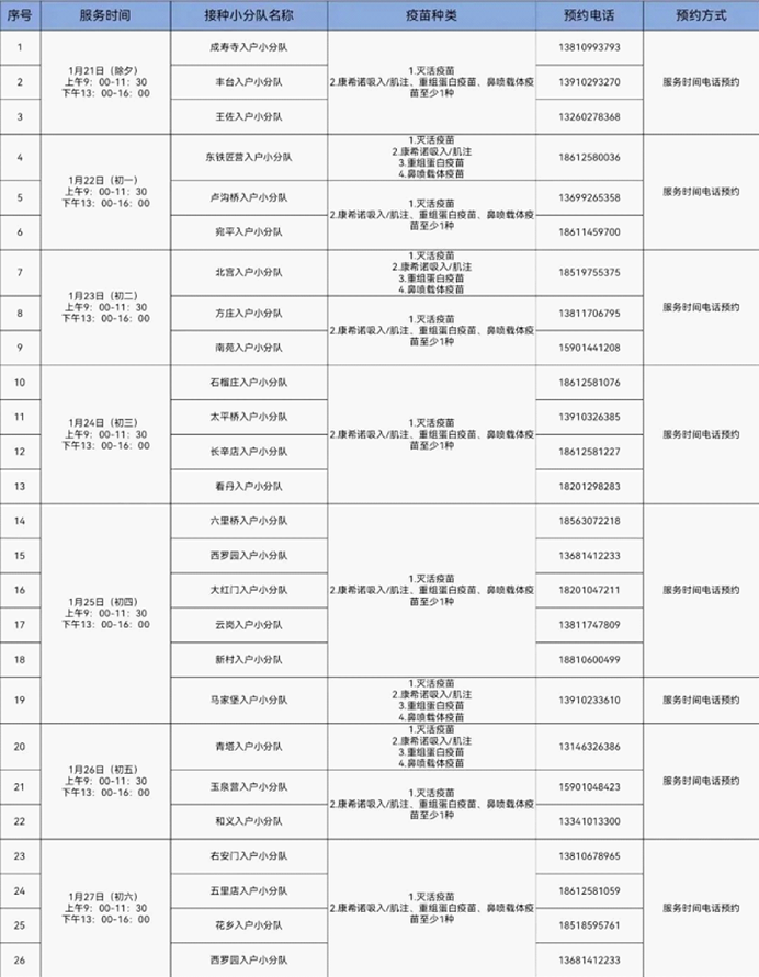 丰台区春节期间全职入户接种小分队接种安排表