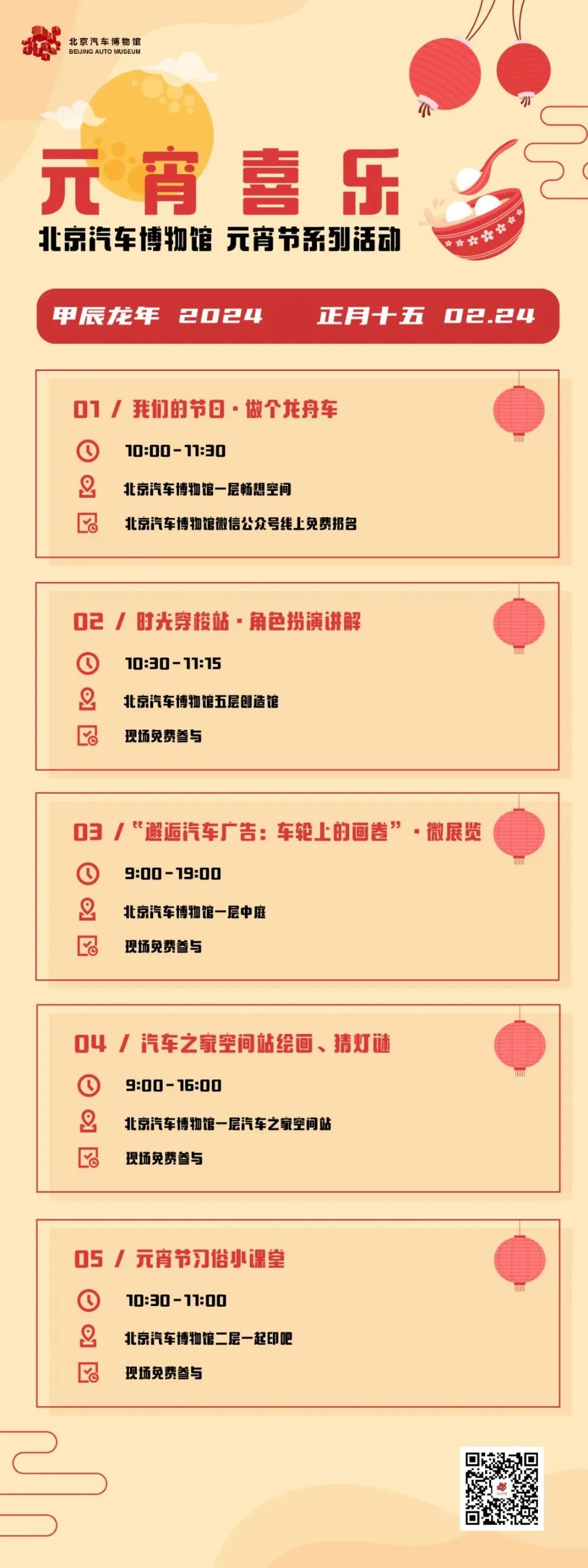 2月24日,北京汽车博物馆将推出“我们的节日·做个龙舟年”“时光穿梭站·角色扮演讲解”“元宵节习俗小课堂”等活动,让孩子们游玩的过程中,还能学习到传统文化知识,很适合小朋友来体验哦~