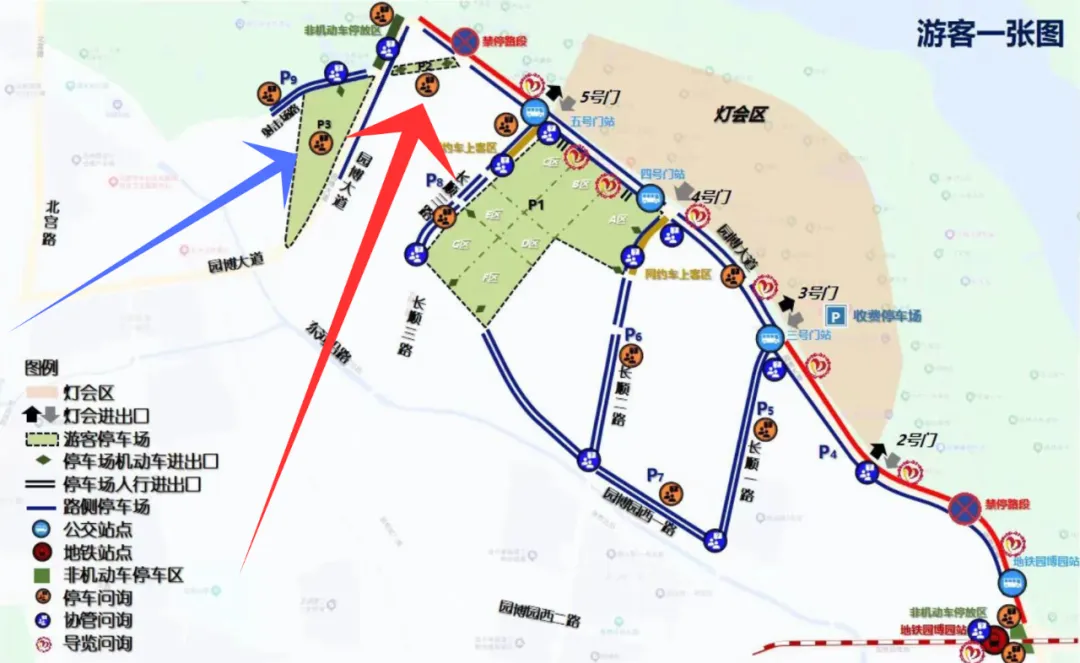 其中P1为集中停车场,容量最大;位于园博大道、长顺一路、长顺二路、园博西一路、长顺三路以及射击场路园林博物馆以西区域,标号为P4、P5、P6、P7、P8和P9的停车场,是综合利用周边道路开放的路侧停车,在P1停车场车位饱和的状态下,请您服从现场民警和交通疏导人员指挥,就近路侧停车。