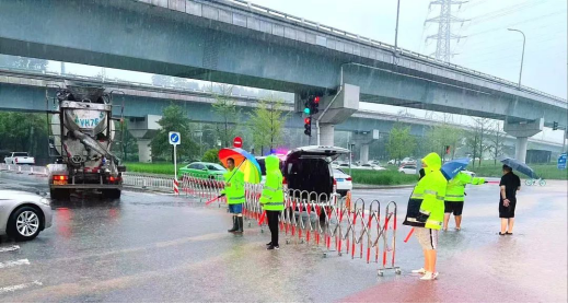 防汛人员值守在重要道路两侧及公交车站,接送过往居民、引导车辆安全通行、劝阻行人如无必要尽量不出门,同时启动抽排作业,全力保障行人和车辆正常通行。