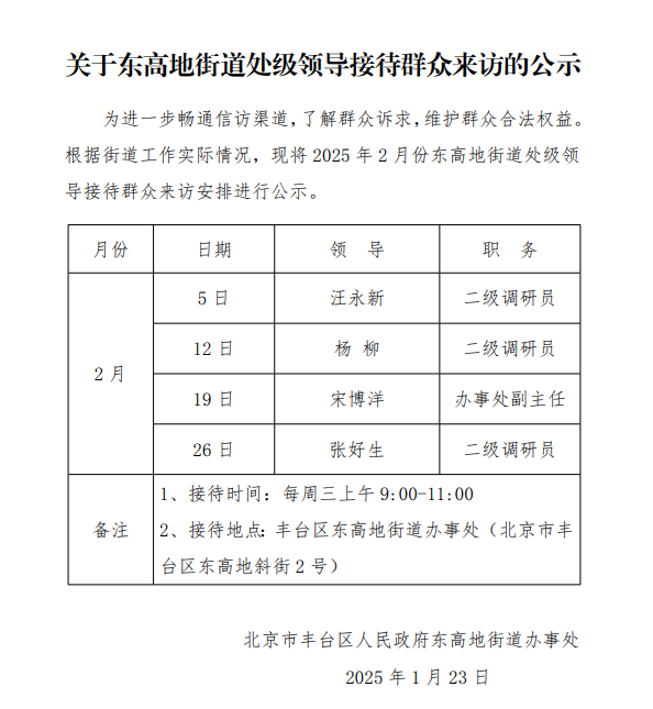 关于东高地街道处级领导接待群众来访的公示