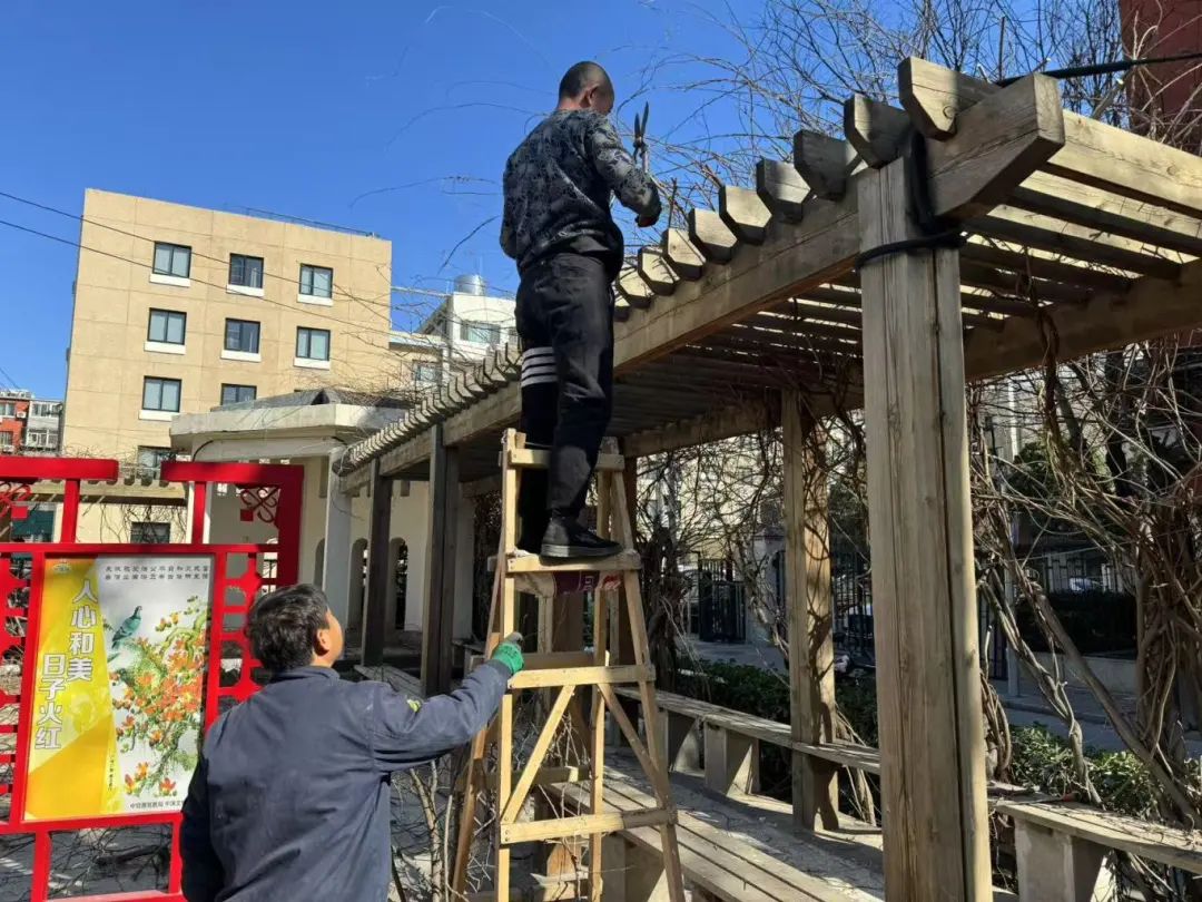 志愿者袁师傅踩着梯子爬上长亭顶部,用修剪锯剪掉多余树枝;其他志愿者则负责清理树枝,避免堵塞道路。经过数小时的奋战,原本被杂乱的藤蔓包裹的长亭恢复了原本的模样,阳光重新洒满庭院小径。随后,志愿者们又将花园内的其他垃圾都清理出来,花园面貌焕然一新。