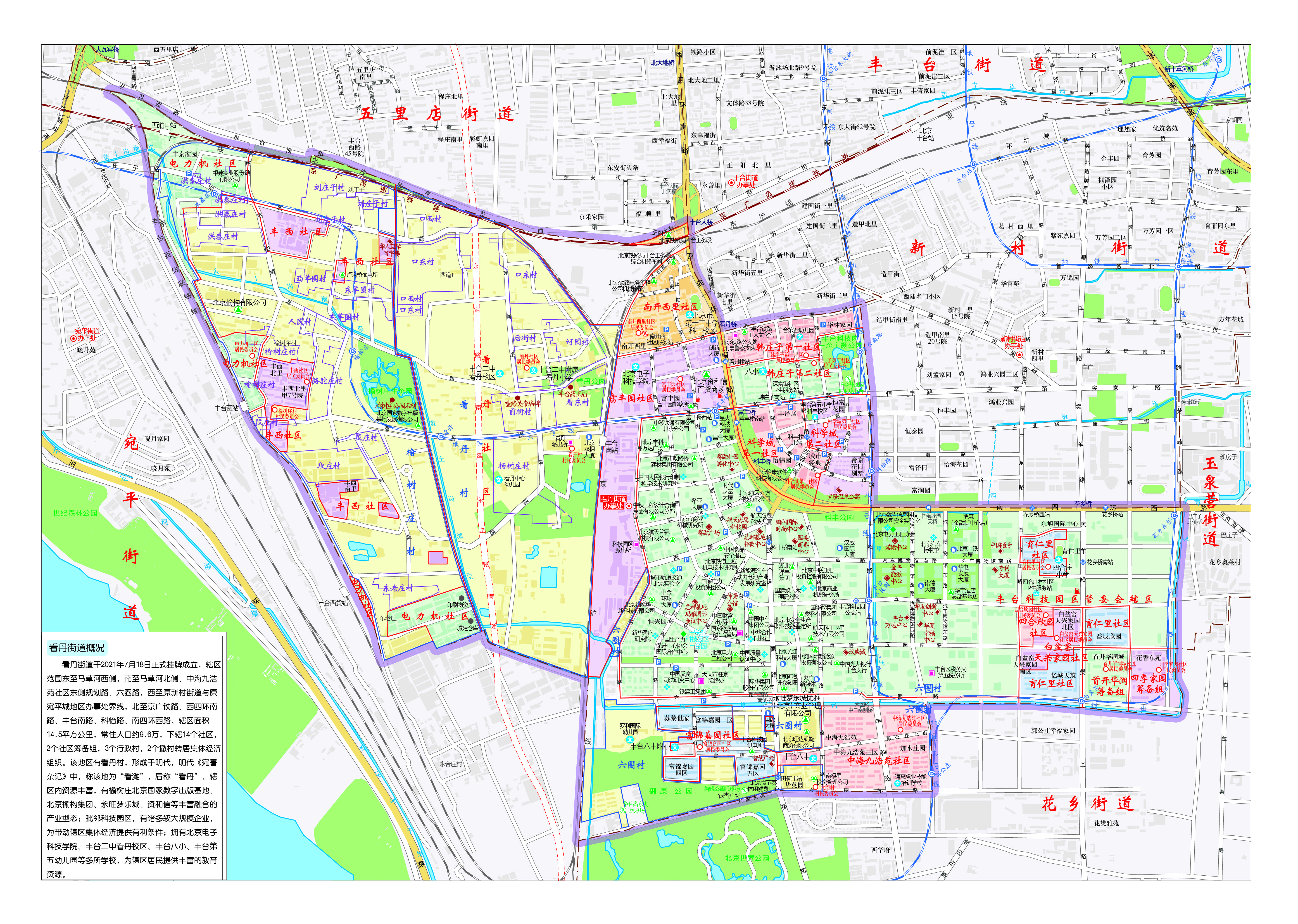 2021年7月,丰台区发布丰政发〔2021〕5号文件,设立看丹街道办事处,下辖14个社区、2个社区筹备组、3个行政村、2个撤村转居集体经济组织。14个社区:天兴家园社区、四合欣园社区、看丹社区、富丰园社区、育仁里社区、电力机社区、丰西社区、科学城第一社区、科学城第二社区、韩庄子第一社区、韩庄子第二社区、中海九浩苑社区、富锦嘉园社区、南开西里社区;2个社区筹备组:首开华润城社区筹备组、四季家园社区筹备组;3个行政村:看丹村、榆树庄村、六圈村;2个撤村转居集体经济组织:北京白盆窑天兴投资管理公司、北京市四合庄兴鹏投资管理中心。