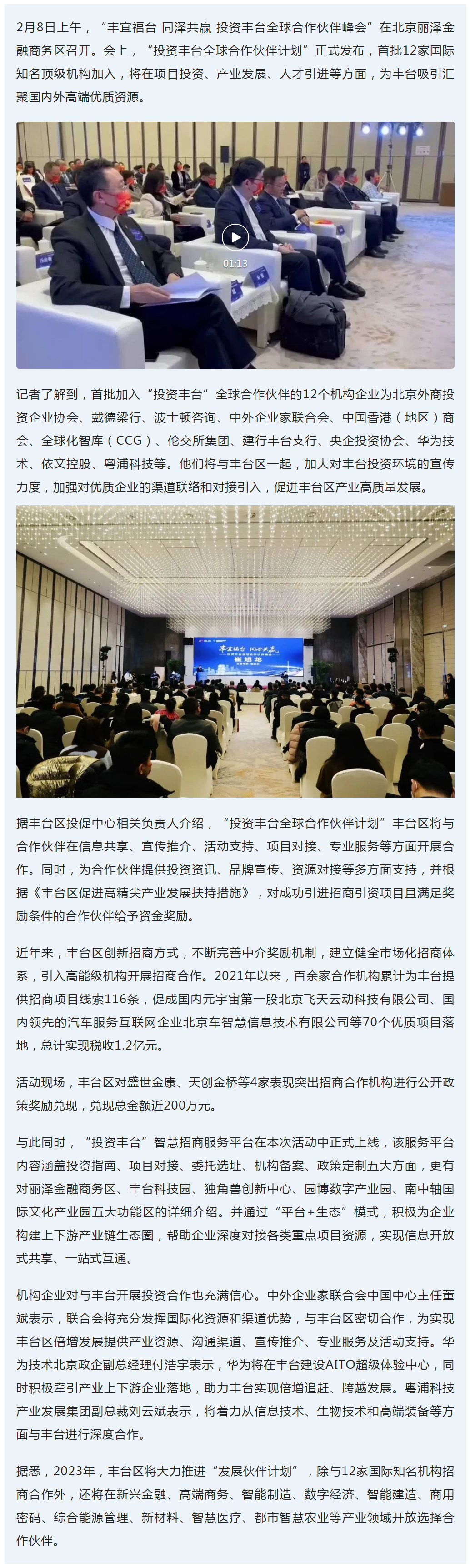 “投资丰台全球合作伙伴计划”发布 首批12家国际知名机构加入 将为丰台牵线优质投资资源
