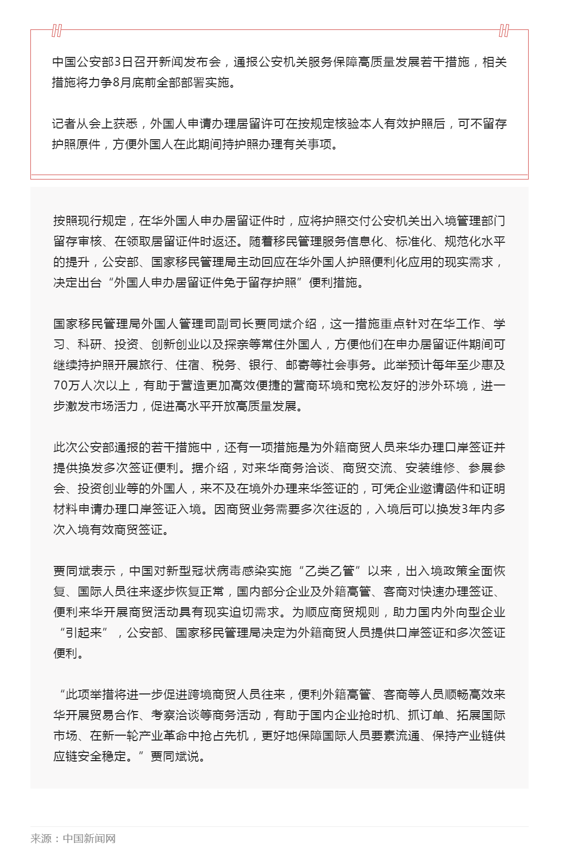 中国出台便民措施 外国人申办居留证件可免于留存护照